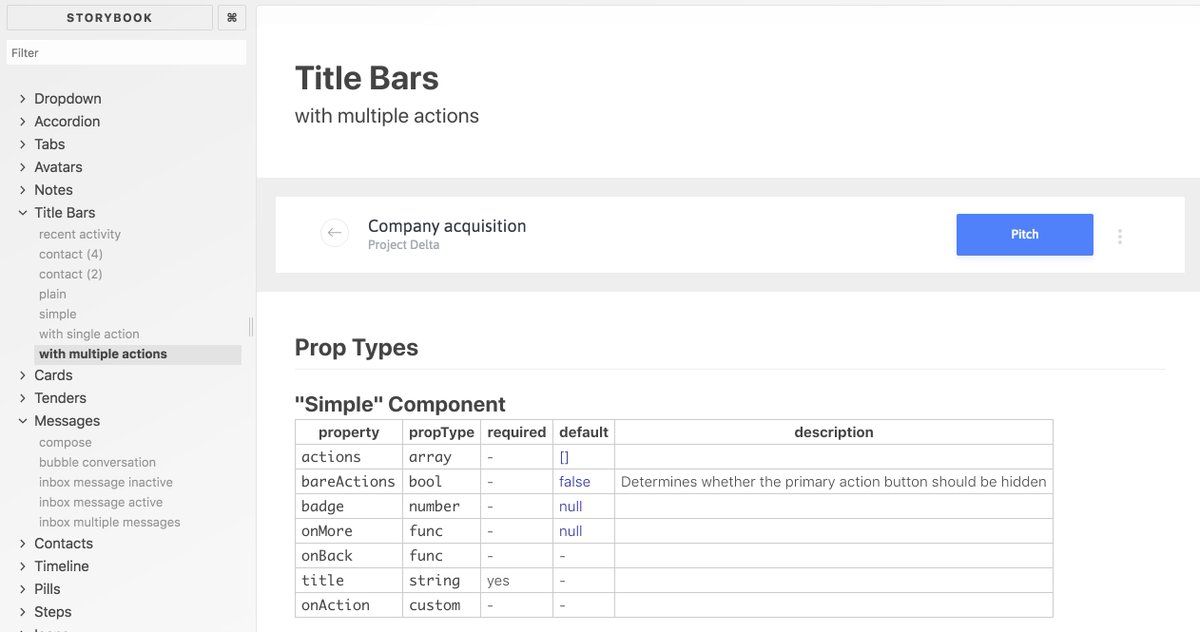 brad_frost reactjs Good stuff. I like that I can see your directory structure (feels like everyone has their own methods, I approve of yours/pinches it). You might like storybook info addon too (shot below - with hidden) - obvs my proptypes need more comments, but gives you an idea.