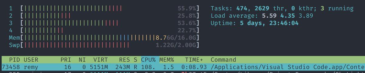 1. Honestly I enjoy using code as my editor, but I'm so fucking sick and tired of having to deal with this CPU hogging on a daily basis. Apparently tsserver.js is going ape shit. Ironic that I don't use TypeScript, but have inherited from some rando extension.