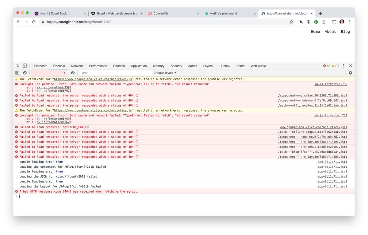 CarolSaysThings Ah, it's a service worker problem. The page loads fine in incognito, but not at all in my normal browser (which is loaded with your service worker). I can't see exactly the cause (the sw is compressed). I wonder if the SW should have updated and hasn't?