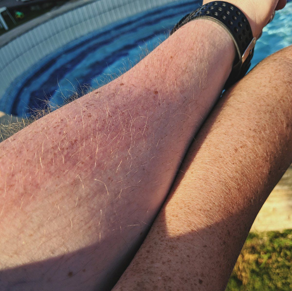Red, white and brown. My "factor 50 impervious skin" (