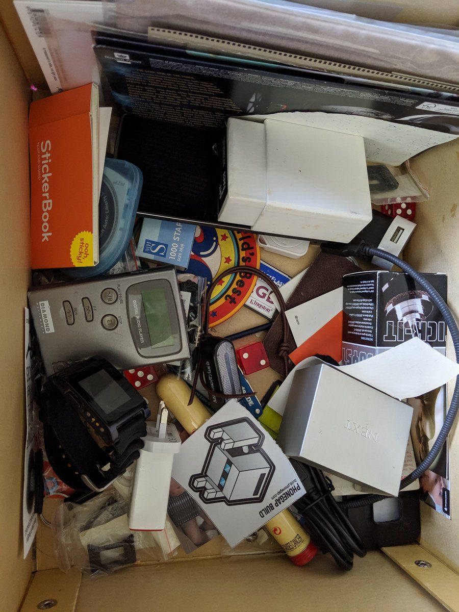 Moo stickers, Rio MP3 player, cigar (from 15yrs ago), old pebble, dice, cufflinks, dodgy business cards of me mostly naked…, staples (no stapler), 2gb compact flash, OnePlus 1, GTA for the PSP…