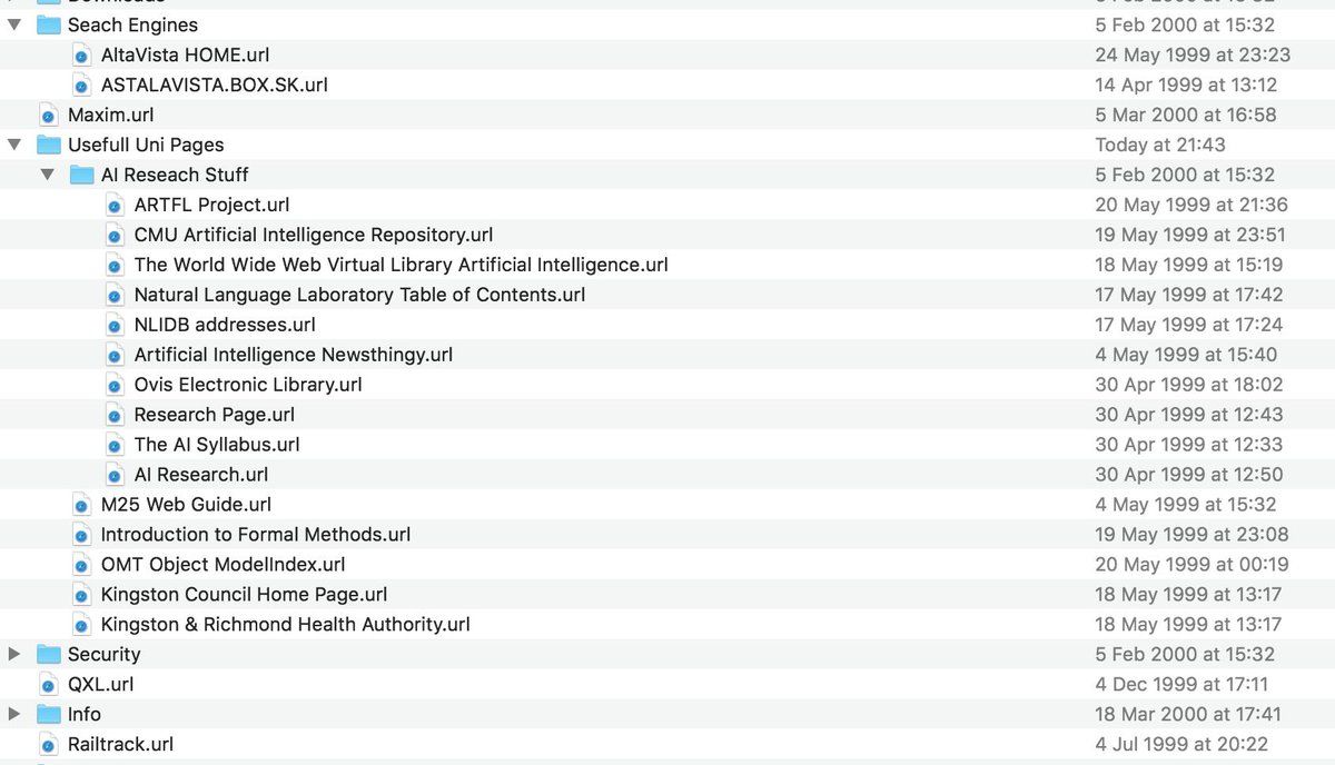 Discovered old (20 years old) hard drives that although I couldn't mount, I'm able to recover files (all named as rawfile_nnnnn.htm/zip/etc). Amazingly I've found my bookmarks from 1999. Going to park that for a fun blog post!
