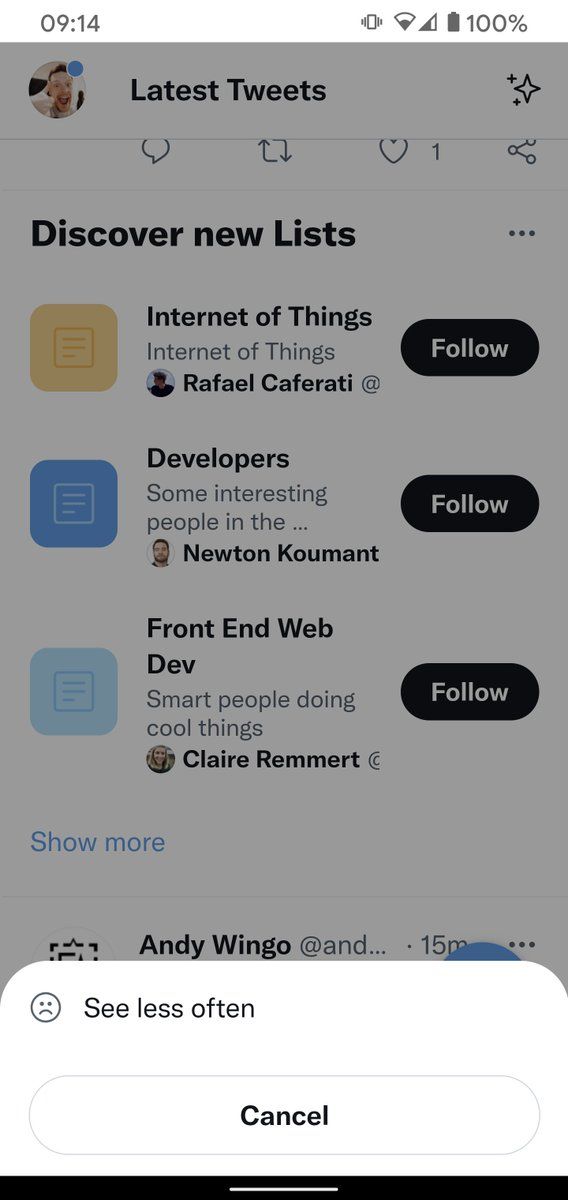 Loving Twitter's attempt at dark patterns. The confirm "button" to see less often is actually the thing that looks like the title.
