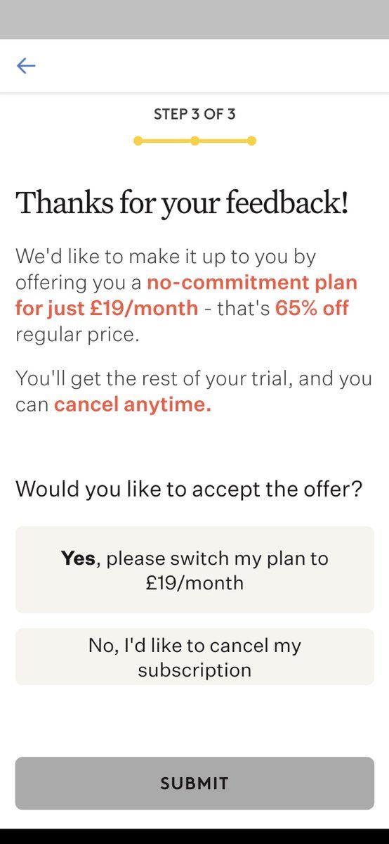 Tried Noom for nutrition and exercise advice. Didn't really like it (bugs, UX issues, bots on support, but the content is good if you're a beginner). But once you're in the trail, cancel it (give a reason) after a week and few days, it'll drop your price hugely. #darkpattern?