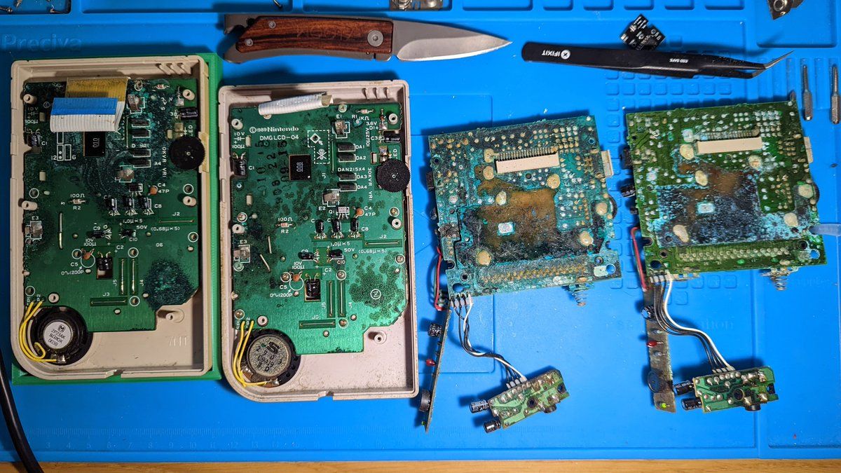 Spent two hours desoldering parts of these two corrosion ridden boards (they're bad ones I've posted before). That's 2/26 definitely dead. Plus now I stink of "chipwick".