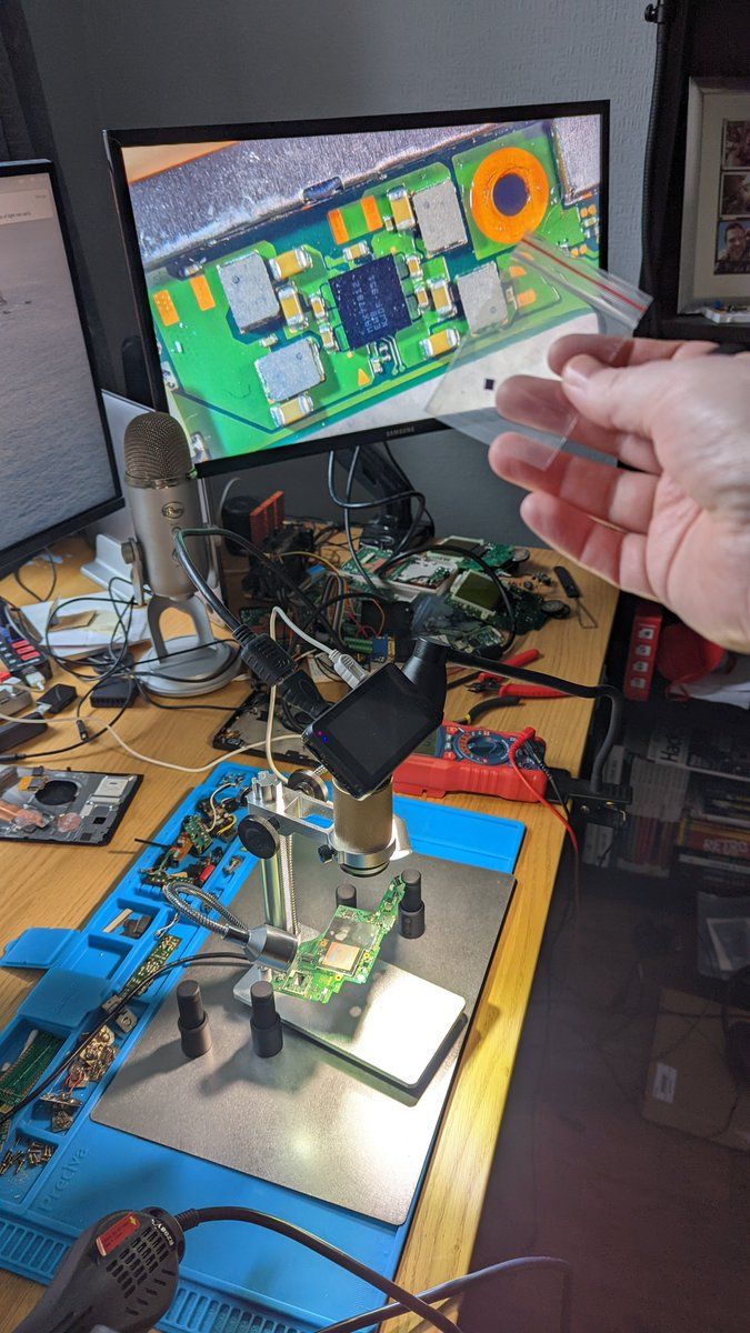 About to attempt soldering a ball grid array chip - flipping tiny, with my microscope to monitor setup. Obviously moments after this photo I realise it's the wrong flipping chip!!! (I'd bought the chip for the underside by accident)
