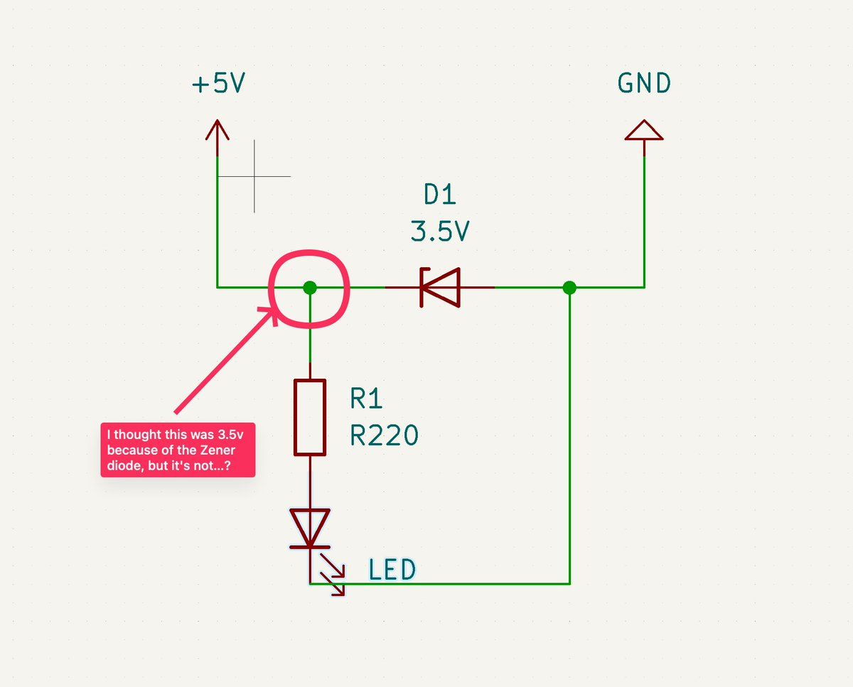 Doing some really (I thought) simple electronics. I have a 3.5V zener diode, but I thought the line off to R1 would be 3.5, and not 5V (i.e. the input). Please someone school me with basic talk!?