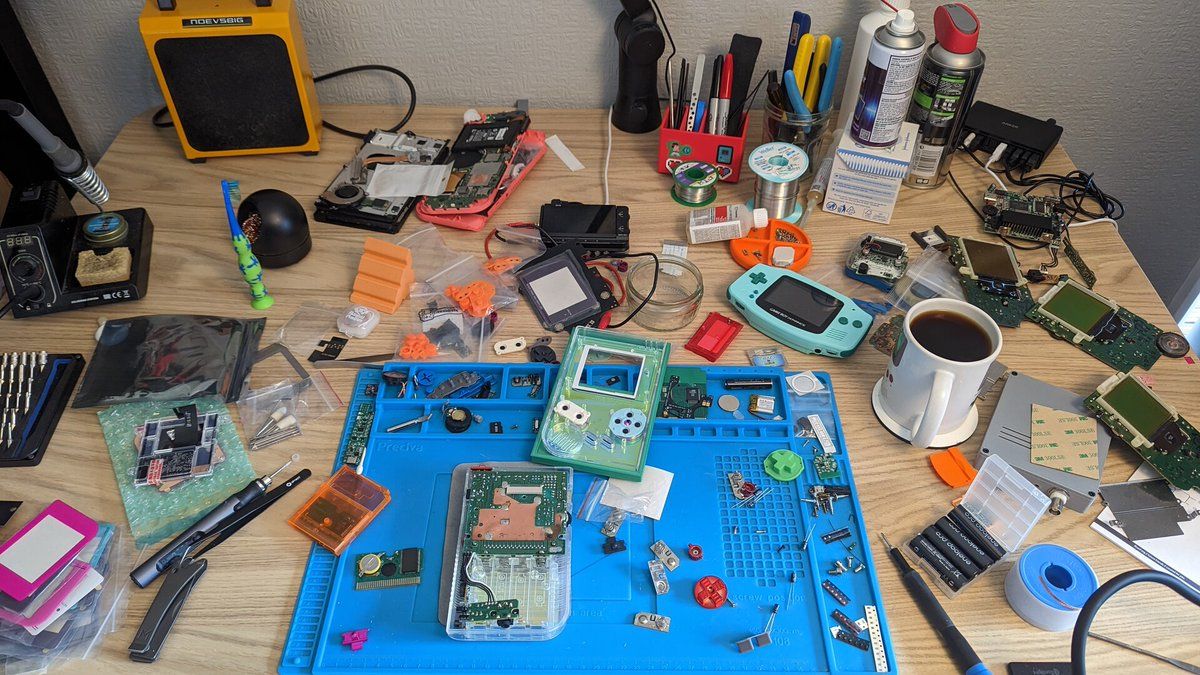Tech audit: - Pokémon mini x 2 - Gameboy displays x 3 - Switch - Switch lite - Oscilloscope - Gameboy advance - Gameboy x 2 - Power bench supply - Microscope - Solder station - Extractor fan - Fuck load of random parts