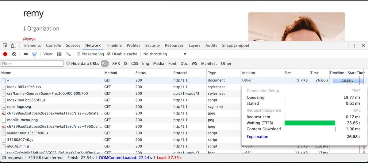getting very long TTFB on requesting the ~ URL on npmjs (rest of assets very quick).