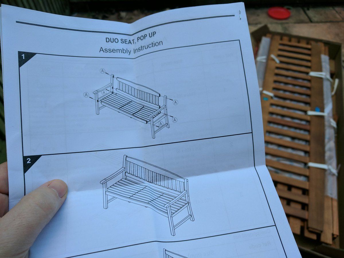 Putting together a new bench for the garden. The instructions are simply 2 steps: 1) make it, 2) it's made