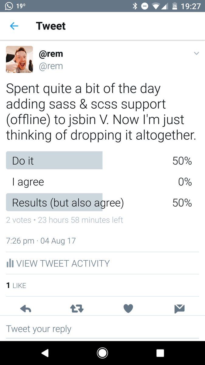 Spent quite a bit of the day adding sass & scss support (offline) to jsbin V. Now I'm just thinking of dropping it altogether.